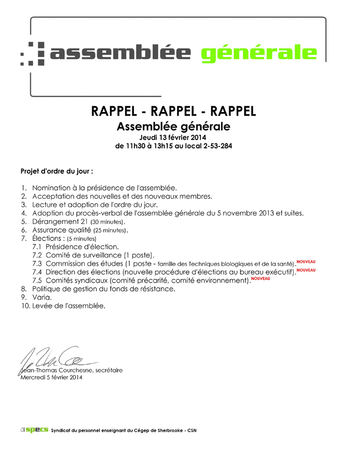 Note: Au même moment, il y aura suspension de cours pour la tenue de l'assemblée étudiante.